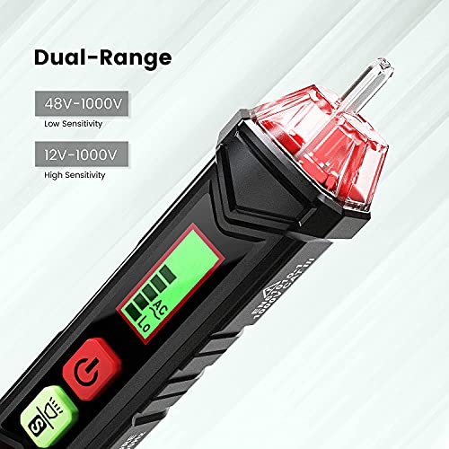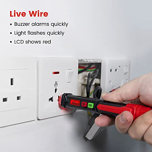 SAFETY FIRST: It will send out multiple alarms through sound and light. When the voltage is detected, the tip will send out red light and beep. When the higher the sensed voltage is, or the closer it is to the voltage source, it beeps at a higher frequency. At the same time, the screen will be red or green, red means high voltage and live wire are detected, green means low voltage and null wire are detected.